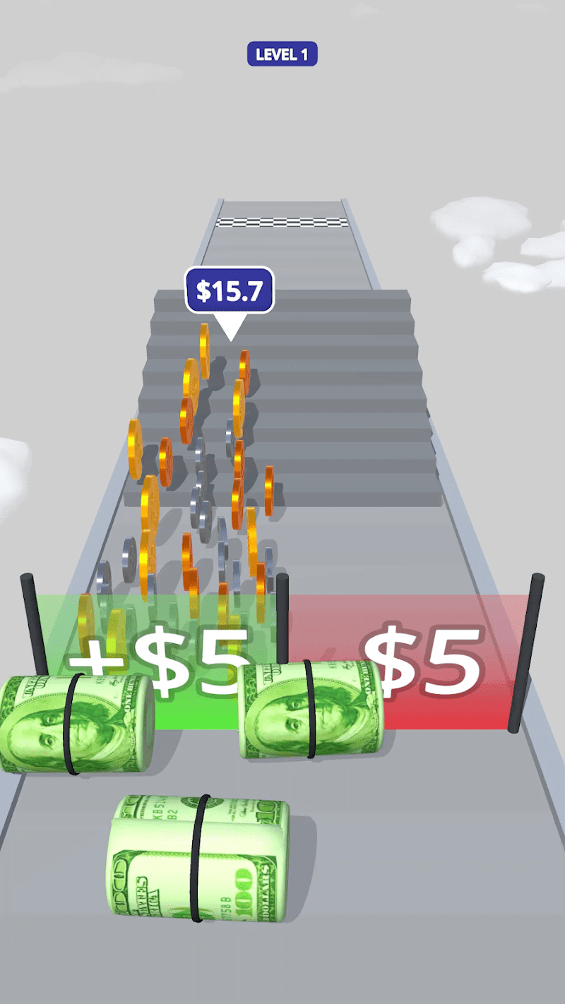 Money Rush is an exciting mobile game that takes players into a world full of money and adventure. In this game, players need to improve their wealth and status by constantly making money, while also facing various challenges and obstacles. The gameplay of the game is very simple, players need to control a small person running through various scenes, collecting gold and treasure. Players can control the jumping and gliding of small figures by clicking on the screen to avoid obstacles and enemy attacks. At the same time, players can also use a number of items to increase their abilities, such as acceleration items to make small people run faster, shield items to protect the player from damage.